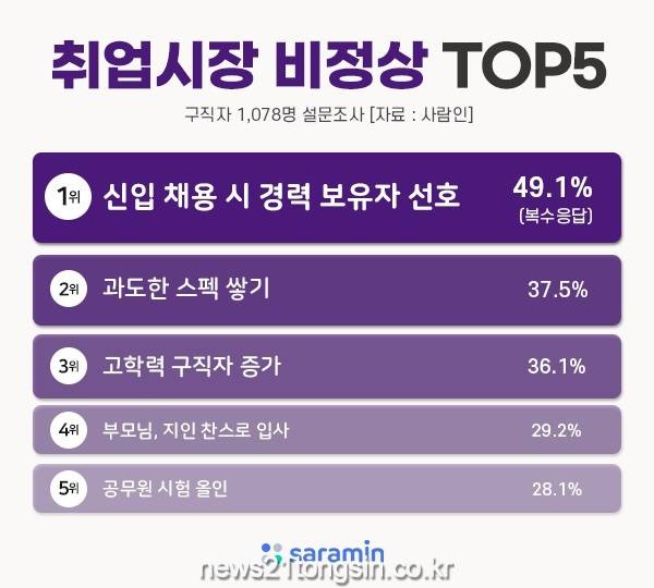 취준생들이 생각하는 현재 취업시장의 가장 비정상적인 부분은 무엇일까? 구인구직 매칭 플랫폼 사람인(www.saramin.co.kr, 대표 김용환)이 구직자 1,078명을 대상으로 ‘취업 시장 비정상’에 대해 조사한 결과, ‘신입 채용 시 경력 보유자 선호’(49.1%, 복수응답)가 1위를 차지했다. 기업들이 신입 채용에서 조차 ‘경력 보유’에 대해 질문하거나 경력을 보유한 ‘올드루키’를 선호하면서, 정작 신입 지원자가 설 자리가 작아지는 것을 가장 비정상적인 행위로 보고 있었다.
