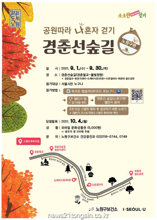참여를 희망하는 주민은 ‘워크온’ 앱을 설치하고 노원구 공식커뮤니티 ‘걷는 도시 노원’ 가입 후, ‘경춘선 숲길 챌린지’ 참가 신청을 하면 된다. 이후 스탬프 획득지점을 경유해 걸으며 3개 이상의 스탬프 획득하면 상품권 응모 자격이 주어진다.