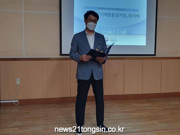 공직자 이해충돌방지법 연수는 교육청 배부 교육자료를 활용하여 8월 27일(금) 전직원을 대상으로 실시되었다. 신규 도입된 행위기준인 제5조, 6조, 8조 내지 15조를 중심으로 사적 이해관계 신고, 고위공직자 민간분야 업무활동 내역 제출, 직무관련 영리 행위 금지, 가족 채용 제한, 수의계약 체결 제한, 퇴직자 사적 접촉 신고, 민간 부문 부정청탁 금지, 사적 노무 요구 금지, 직무관련자 거래 신고 등에 대해 이해하고 사례를 살펴보는 시간을 가졌다. 모든 교직원이 자신의 공적 직무수행 시 사적 이해관계가 관련되지 않도록 공정한 업무를 수행할 것과 청렴한 공직자로서의 자세를 다짐하였다.