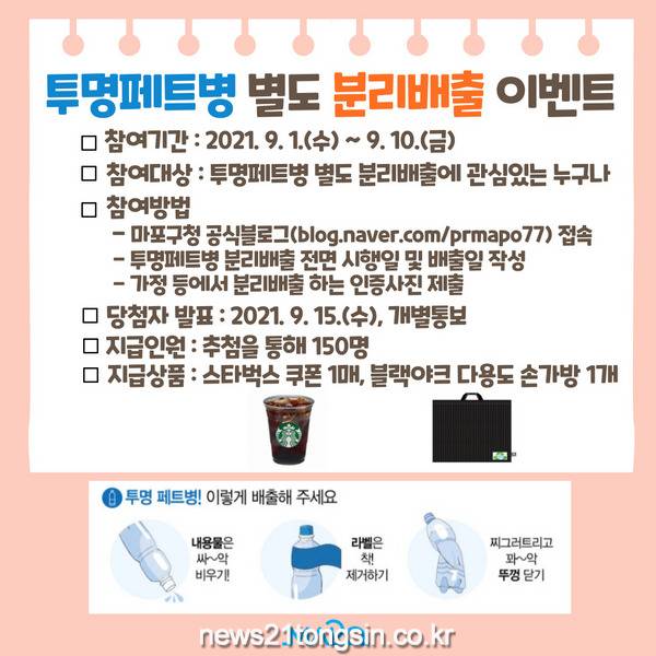 마포구(구청장 유동균)는 올해로 13회차인 자원순환의 날을 기념해 9월 1일부터 9월 10일까지 ‘투명페트병 분리배출 홍보 이벤트’를 실시한다고 밝혔다.