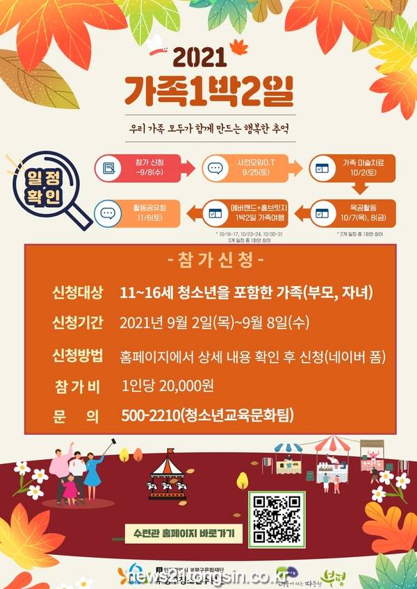 본 행사는 오는 9월 25일부터 11월 6일까지 진행하며, 참가비는 1인당 2만 원이다. 참가 신청은 부평구 청소년수련관 홈페이지 (http://portal.icbp.go.kr/bpy/)에서 내용을 확인하고 온라인으로 신청하면 된다.