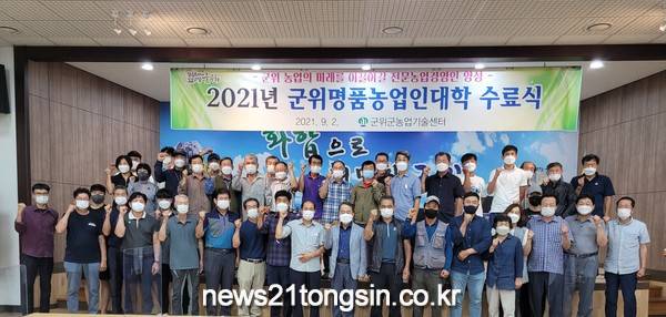 군위군은 2일 농업기술센터에서 농업전문 인력양성을 목표로 운영한 군위명품농업대학 사과·포도과정 45명이 수료식을 가졌다.