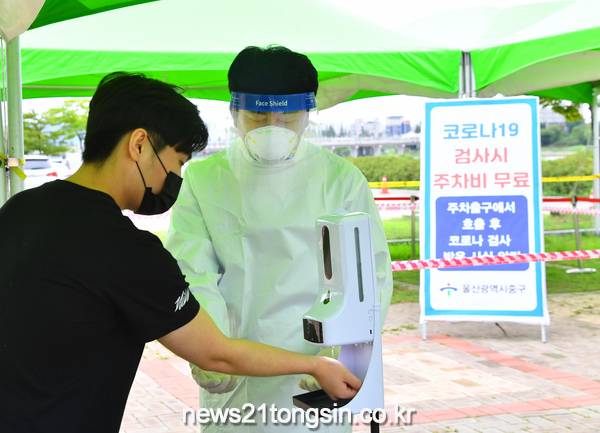 (뉴스21통신/박형만기자)=박태완 울산 중구청장이 2 일 성남둔치 임시선별진료소 찾은 시민들을