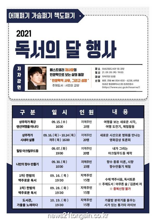 김주수 의성군수는 “코로나19로 문화를 향유할 기회가 줄어든만큼 이번 독서의 달 행사에 참여해 책과 함께하는 즐거움을 누리셨으면 한다”고 전했다.