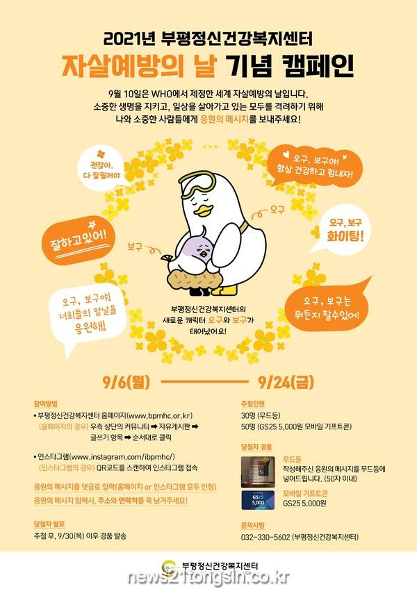 부평구(구청장 차준택)보건소가 오는 24일까지 약 3주간 부평구민을 대상으로 ‘2021년 세계 자살예방의 날 기념 온라인 캠페인’을 실시한다.