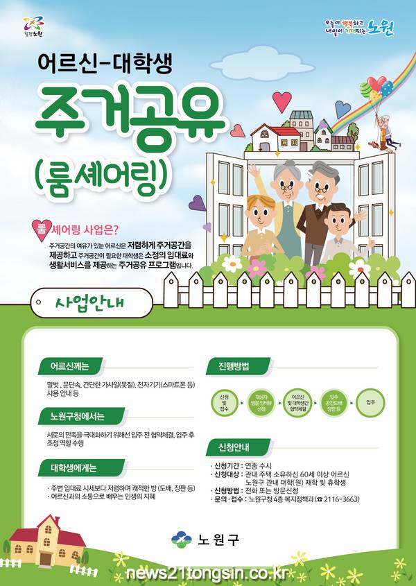 서울 노원구(구청장 오승록)가 지역 내 어르신과 대학생이 주거 공간을 공유하는 ‘룸 셰어링’ 사업을 펼친다.