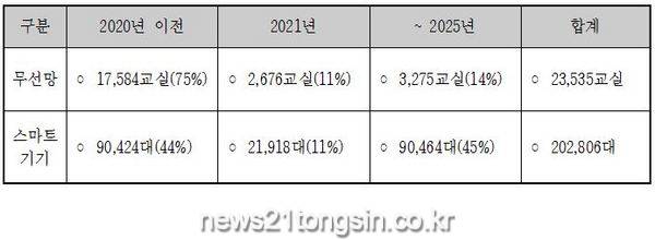 (대구=뉴스21통신) 유재원기자 = 대구시교육청은 2025년까지 관내 초·중·고·특수학교 모든 교실에 무선 인터넷망을 구축하고 1학생 1스마트기기를 보급한다.