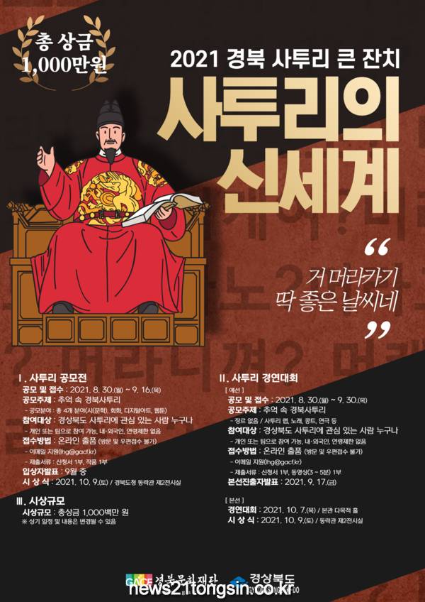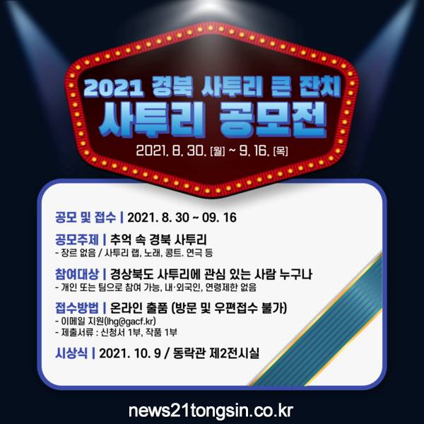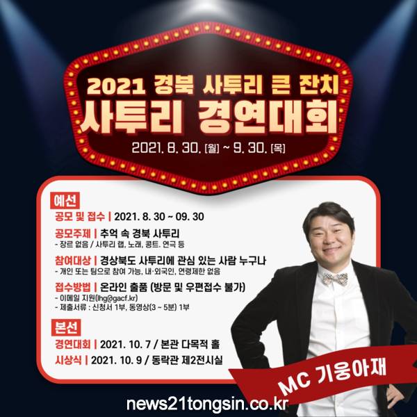 사투리 경연대회는 경북의 사투리로 구성된 연극, 콩트, 노래 등 다양한 장르로 9월 30일까지 참여 신청 가능하며 경북 사투리에 관심 있는 누구나 참여할 수 있다.