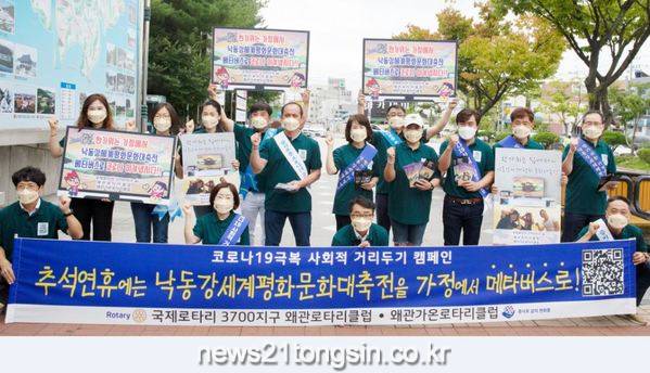 (대구=뉴스21통신) 유재원기자 = 지난 15일 왜관로타리·왜관가온로타리클럽 회원 20여 명은 왜관역 광장에서‘한가위는 집에서 낙동강 세계평화 문화 대축전(이하 낙동강 대축전)’챌린지를 진행했다.