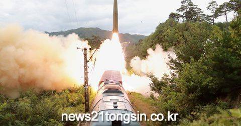 북한 조선중앙통신이 지난 15일 열차에서 미사일이 시험 발사되고 있는 사진을 16일 공개했다.