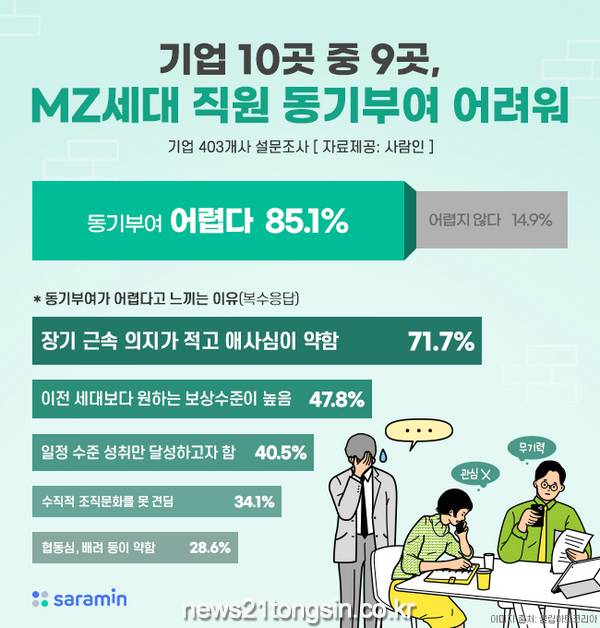 구인구직 매칭 플랫폼 사람인(www.saramin.co.kr, 대표 김용환)이 기업 403개사를 대상으로 ‘MZ세대 직원을 동기부여 현황’을 조사한 결과, 대부분인 85.1%가 ‘동기부여하기 어렵다’고 밝혔다.