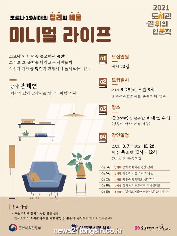 문화체육관광부 주최 ‘2021 도서관 길 위의 인문학’ 수행기관으로 선정된 도봉구(구청장 이동진) 도봉아이나라도서관은 코로나19 속 더욱 중요해진 주거공간과 그 속에 머무는 우리들의 내면 성찰해보는 인문학 강좌 ‘정리와 비움, 미니멀라이프’를 진행한다.
