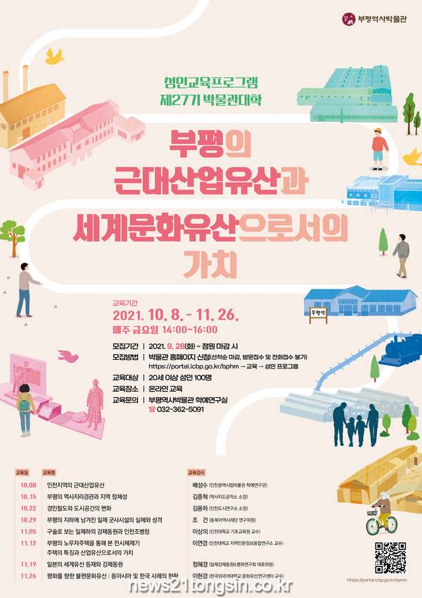 20세 이상 성인이 대상이며, 오는 9월 28일부터 부평역사박물관 홈페이지(https://portal.icbp.go.kr/bphm)를 통해 신청 가능하다. 수강료는 무료다.
