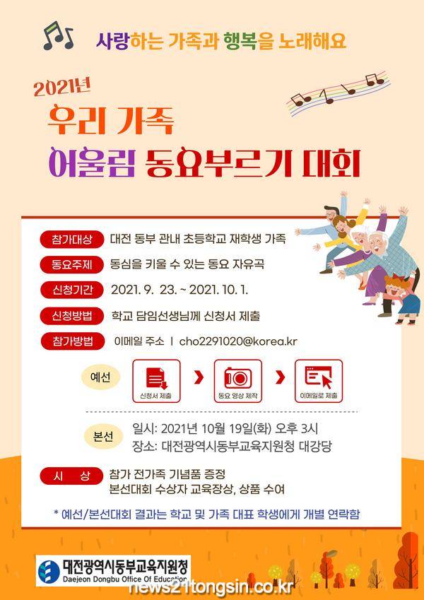 대전광역시동부교육지원청(교육장 고유빈)은 9월 23일(목)부터 10월 19일(화)까지 동부 관내 초등학생 가족을 대상으로 「2021년 우리 가족 어울림 동요부르기 대회」를 개최한다고 밝혔다.