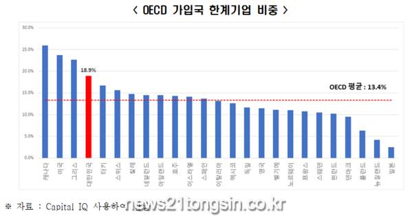 전국경제인연합회(이하 전경련)는 OECD 가입국을 대상으로 영업이익으로 이자비용도 내지 못하는 상태가 3년간 지속되는 ‘한계기업’ 비중을 조사하였다. 그 결과, 한국의 한계기업 비중은 ’20년 기준 18.9%로, 조사대상 25개 국가 중 네 번째로 높은 것으로 드러났다.