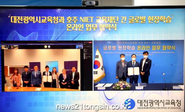 대전광역시교육청(교육감 설동호)은 특성화고 글로벌 현장학습 운영을 위하여 호주 직업교육기관인 NIET 교육재단과 업무협약식을 9월 27일(월)에 실시간 온라인으로 체결하였다고 밝혔다.