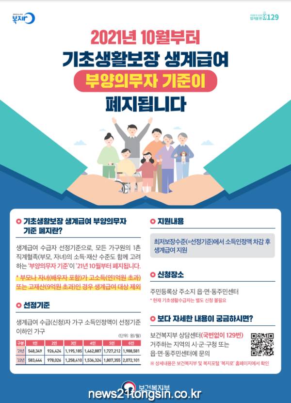 보건복지부는 2022년 1월부터 생계급여 수급자에 대한 부양의무자 기준을 폐지할 예정이었으나, 복지사각지대 해소 및 기존 수급자에 대한 보장 강화와 코로나19 장기화 등의 상황을 고려하여 3개월 당겨서 10월부터 시행하기로 했다.