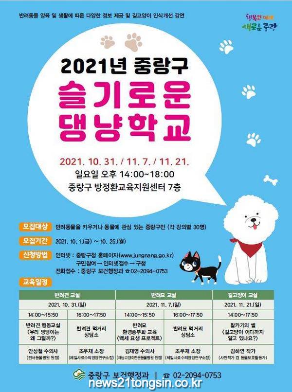 중랑구(구청장 류경기)가 올바른 반려문화 정착과 동물보호 인식개선을 위해 ‘2021년 슬기로운 댕냥학교’ 참여자를 모집한다고 밝혔다.