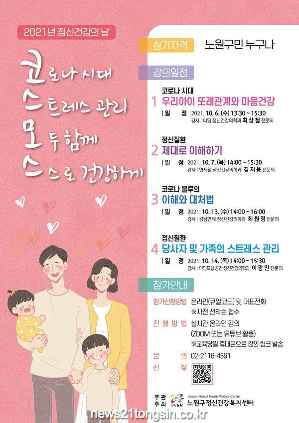 노원구정신건강복지센터에서 주관하는 이번 행사는 10월 4일부터 17일까지 2주간 진행된다. ‘코・스・모・스’는 ‘코로나시대 스트레스 관리 모두 함께 스스로 건강하게’의 줄임말로 장기화된 코로나19로 인해 악화된 구민 마음건강 회복과 일상생활 복귀를 위해 마련됐다.