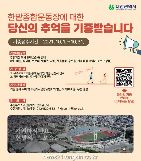 대전시는 10월 한 달간 한밭종합운동장과 관련한 자료를 소장하고 있는 시민을 대상으로 기증 캠페인을 추진한다고 밝혔다.
