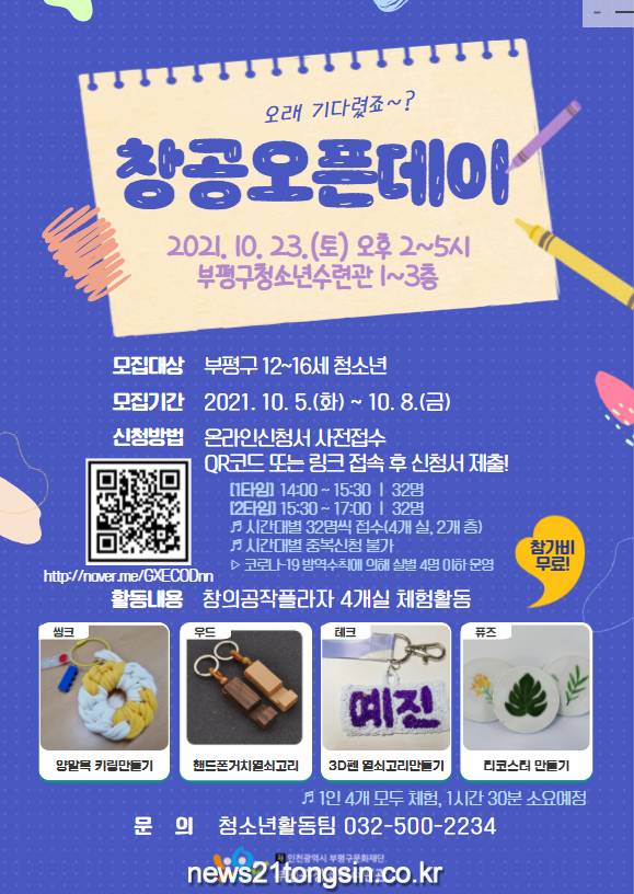오는 23일 예정된 창공오픈데이는 코로나19 방역지침에 따라 실별 4명씩, 1타임에 32명씩 사전 접수한 청소년만 참여 가능하다. 참가를 희망하는 청소년은 부평구 청소년수련관 홈페이지에서 온라인 신청서 작성하면 된다.