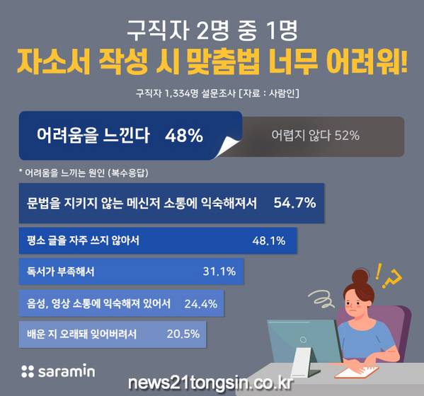 구인구직 매칭 플랫폼 사람인(www.saramin.co.kr, 대표 김용환)이 구직자 1,334명을 대상으로 ‘자기소개서 작성 시 한글 표기에 어려움을 느끼는지 여부’를 조사한 결과, 48%가 ‘어려움을 느낀다’고 답했다.