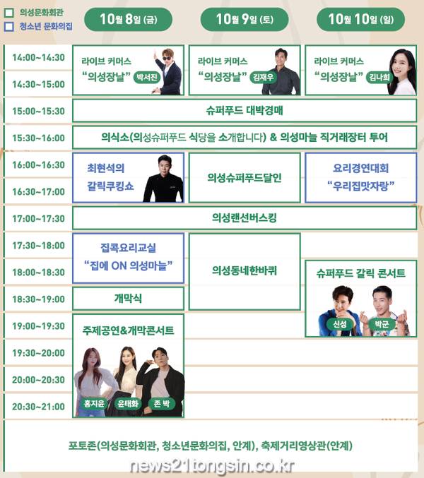 이번 축제는 지역특산품 판매 촉진을 위한 라이브 커머스 ‘의성장날’과 유명 쉐프 초청으로 진행되는 ‘갈릭 쿠킹쇼’, 지역 대표 관광지를 알리는 ‘랜선 버스킹’등 다채로운 프로그램으로 3일간 진행 될 예정이다.