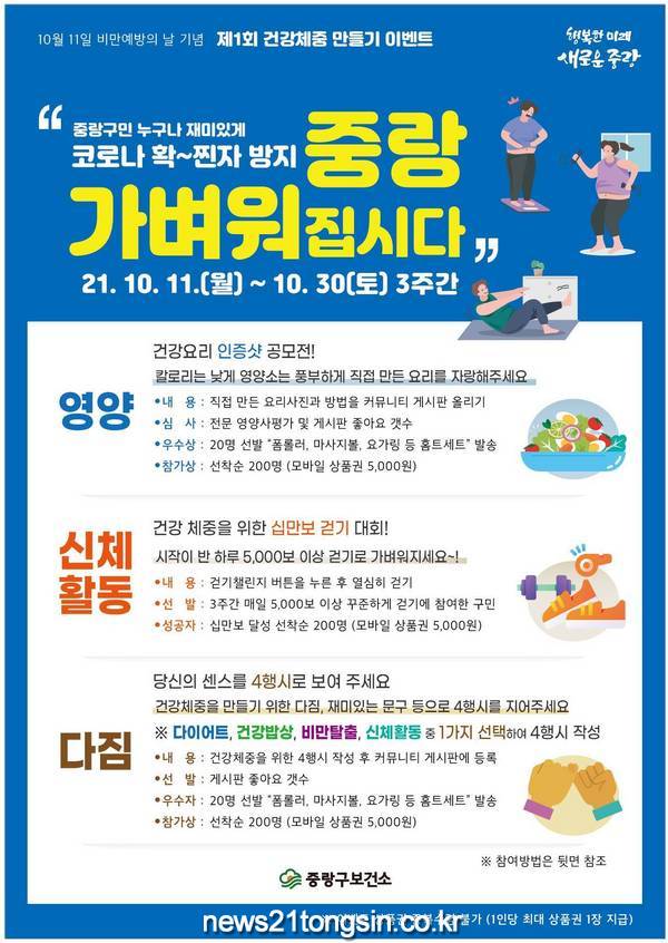 중랑구(구청장 류경기)가 10월 11일 비만예방의 날을 기념해 오는 30일까지 건강체중 만들기 이벤트 ‘중랑, 가벼워집시다’를 진행한다고 밝혔다.