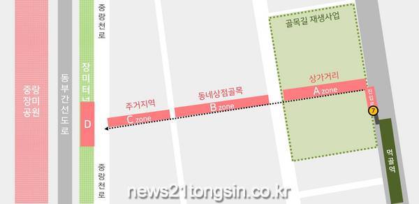이에 구는 이런 불편사항을 개선하고 축제 중심 거리로 거듭날 수 있도록 길을 4개 구간(A~D)으로 나눠 거리 특성에 맞게 만남의 장소 조성, 광장형 상가거리 조성, 가로경관 디자인 개선, 중랑천 제방 주민쉼터 조성 등을 중심으로 사업을 진행한다.