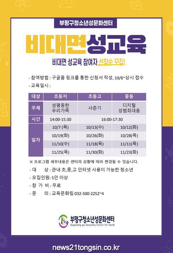 이정호 부평구 청소년성문화센터장은 “코로나19 등으로 청소년들이 혼자 보내는 시간이 많아지며 제대로 된 교육의 필요성이 높아지고 있다”며 “청소년들의 건강한 성장을 위해 준비한 비대면 프로그램에 많은 청소년들의 참여를 기대한다”고 말했다.