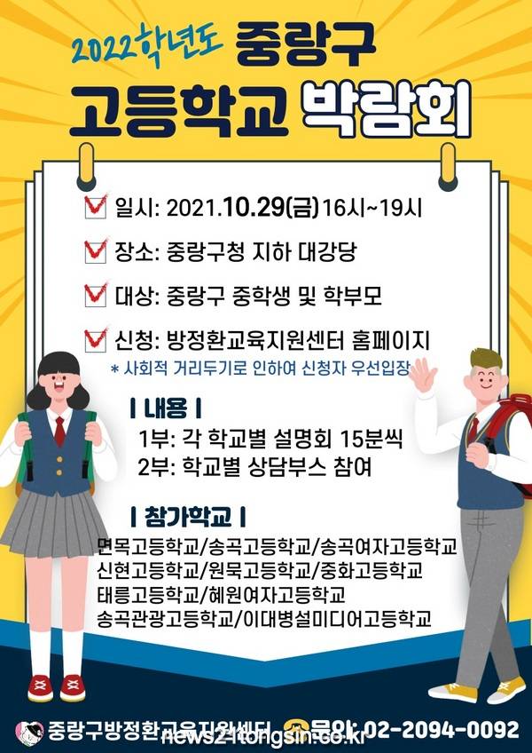 중랑구(구청장 류경기)가 오는 29일 고등학교 진학을 앞둔 지역 학생과 학부모를 대상으로 ‘2022학년도 중랑구 고등학교 박람회’를 개최한다.