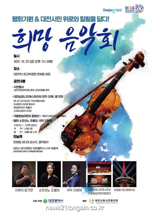 대전시는 오는 22일 오후 7시 30분에 대전엑스포과학공원 한빛탑광장에서 시민 위로와 평화 기원을 담은 ‘희망 음악회’를 개최한다고 18일 밝혔다.