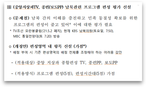 국민의힘 김영식 국회의원(구미을, 과학기술정보방송통신위원회)이 최근 방송통신위원회로부터 제출받은 자료에 따르면 방송평가의 배점 조정 및 평가항목이 총 9건 신설된다. 이 중 남북관련 프로그램 편성 평가 항목을 신설하여 프로그램 편성 시에는 5점을, 편성 시간대 별로 5점을 가점으로 주도록 개정한다.