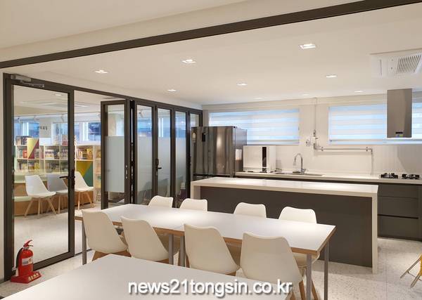 주요 공간은 ▲누구나 향기로운 차와 도서를 즐길 수 있는 ‘북카페‘, ▲다양한 지식을 배울 수 있는 ’프로그램실‘, ▲다함께 요리할 수 있는 ’공유주방‘ 등이다. 특히, 프로그램실과 공유주방을 폴딩도어로 연결해 확장해서 사용할 수 있도록 했다.