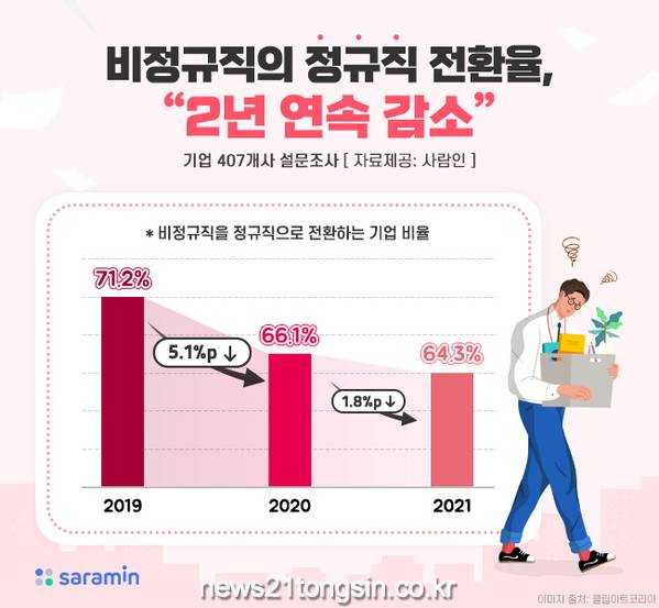 팬데믹 장기화로 경영 상 불확실성이 해소되지 않으면서 기업들의 인력 운용도 보수적인 기조를 유지하고 있다. 이에 따라 비정규직의 정규직 전환율도 감소세인 것으로 나타났다.