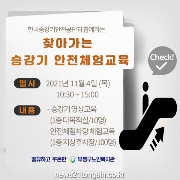 부평구노인복지관(관장: 최민수)은 한국승강기안전공단(이사장: 이용표)과 연계하여 ‘찾아가는 승강기 안전체험교육’을 영상교육과 체험교육으로 나누어 진행한다고 밝혔다.