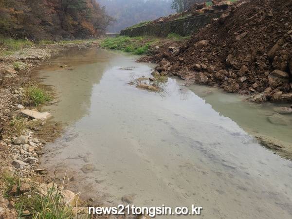 영월군에게 도급액 28억에공사를 맡은 A종합건설이 이곳 공사현장 하천에 레미콘 슬러지 무단방치와 세륜기 미설치 등으로 비산먼지가 발생하고 주변환경을 오염시키고 있다는 지적이 나오고 있지만 관리감독해야 할 영월군은 ‘나 몰라’라 하고 있다.