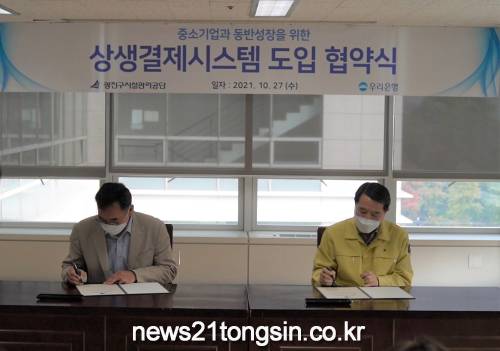 광진구시설관리공단(이사장 김상국)이 10월 27일, 중소기업과의 동반 성장을 위한 ‘상생결제제도’를 도입하기로 하고 주거래은행인 우리은행과 업무협약을 체결했다.