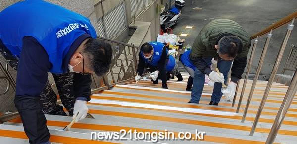 환경분과 회원들이 보행자 통행이 많고 노인층이 주로 거주하는 지역의 계단 현황을 조사해 ▲만리재옛12길 13 ▲만리재로 111 ▲만리재로 131-1 계단 3곳을 사업 대상지로 선정했으며 전문가를 만나 페인트칠 하는 법을 배우기도 했다.