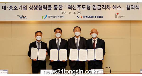 현대위아는 지난 3일 서울 영등포구 중소기업중앙회에서 동반성장위원회와 중소기업의 기술 경쟁력의 강화를 위해 ‘혁신주도형 임금격차 해소 협약’을 맺었다고 4일 밝혔다. 협약식에는 현대위아 정재욱 사장, 동반성장위원회 권기홍 위원장과 협력사 이엠코리아 강삼수 대표, 영진테크 박근종 대표 등이 참여했다.