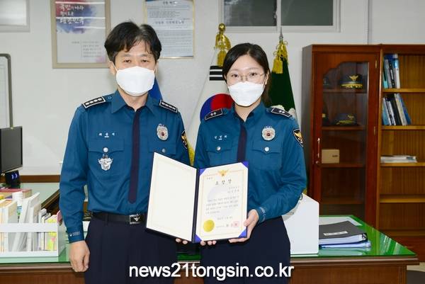 군위 경찰서(서장 최용석)는 8일 오전 서장실에서 군위경찰서 첫 스토킹 범죄 피혐의자를 검거한 당찬 중앙 파출소 김정화 순경에게 포상과 함께 노고를 격려했다.