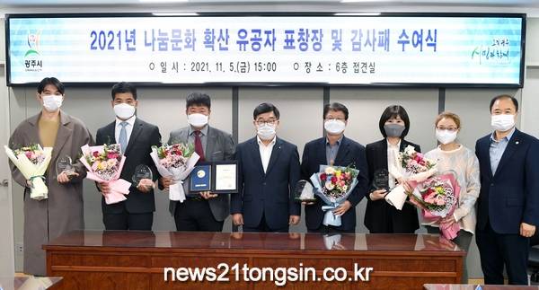 광주시는 지난 5일 나눔 문화에 적극적으로 참여해 지역사회 발전에 기여한 공이 큰 유공자들에게 감사의 마음을 표하고자 표창장 및 감사패 수여식을 진행했다.