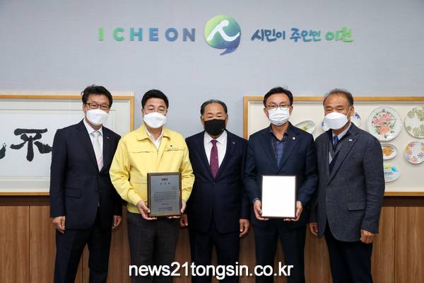 이천시(시장 엄태준)는 중소기업중앙회에서 10일 이천시를 방문하여 ‘이천시 중소기업협동조합 육성 및 지원에 관한 조례’제정(‘21 .11.5.)에 기여한 이천시장, 이천시의회 김하식 의원에게 감사패를 전달했다고 밝혔다.