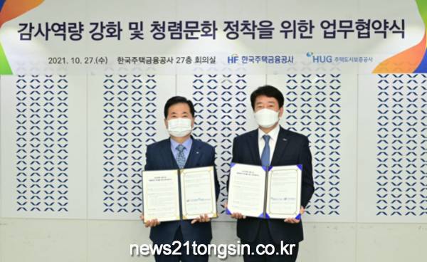 한국주택금융공사(HF, 상임감사 김준일)는 주택도시보증공사(HUG, 상근감사위원 노융기)와 ‘감사역량 강화 및 청렴문화 정착을 위한 감사업무 협약’을 체결했다고 지난달 27일 밝혔다.