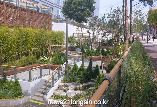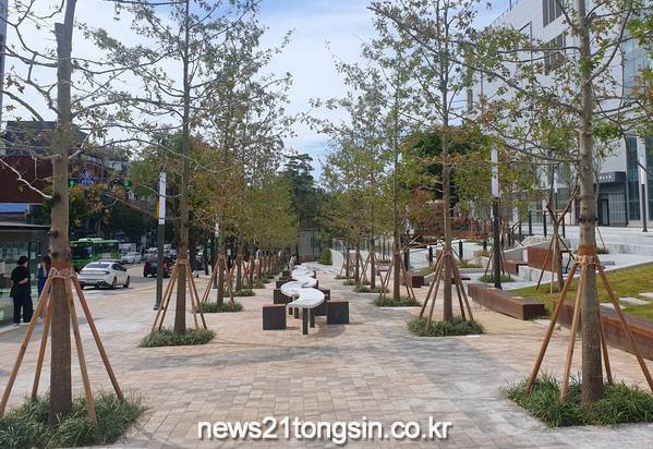 아울러 녹지와 인도 사이를 가로막고 있던 수목을 옮겨 심어 개방감을 높이고 두 곳을 자연스럽게 연결되는 하나의 공간으로 조성했다.