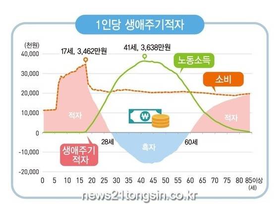 18세 이후 노동을 통한 소득이 발생하면서 적자는 점점 감소한다. 28세에는 노동소득이 소비를 넘어 처음으로 인생 흑자를 보기 시작한다. 노동소득이 가장 커지는 나이는 평균 3638만원을 버는 41세로 나타났다.