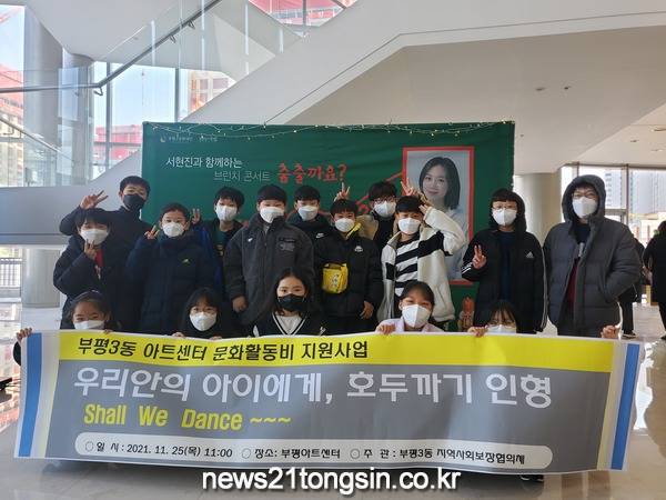 정영희 부평3동장은 “이번 문화체험이 아동들에게 꿈과 희망을 줄 수 있는 소중한 기회가 됐으면 좋겠다”며 “앞으로도 많은 문화체험과 공연관람 기회를 제공해 아이들이 정서적 안정감을 느끼고 건강하게 성장할 수 있도록 노력하겠다”고 말했다.