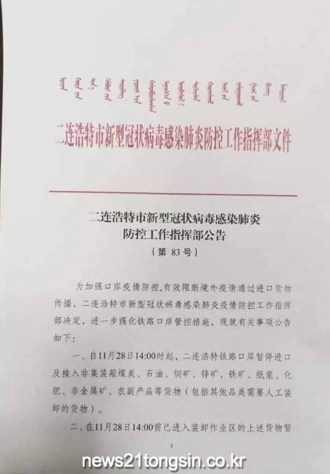 예를 들어, 11월 28일 Erlian 코로나바이러스 예방 및 통제 실무 그룹은 새로운 규정을 발표했다. 규정에 따르면 항구도시는 수입물품을 통한 바이러스 감염 확산을 예방·통제하기 위해 철도항 통제를 강화하고 11월 28일부터 석탄, 석유, 아연광석 등을 경유하여 운송한다. Erlian 철도 항구, 철광석, 철강 광석, 화학 물질, 농산물 및 기타 수동 선적 및 하역이 필요한 제품은 더 이상 컨테이너 없이 허용되지 않는다.