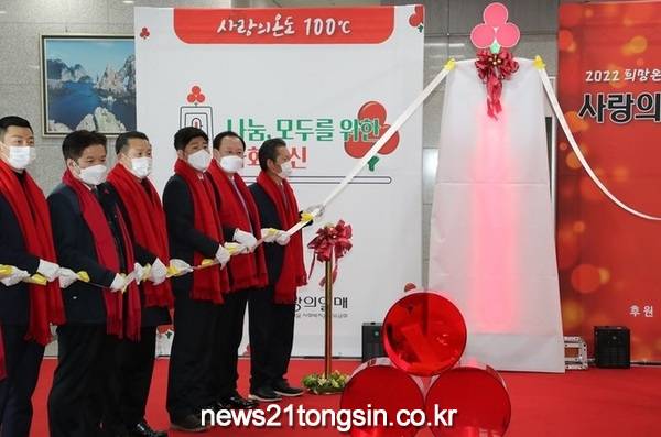 마포구(구청장 유동균)가 지난 23일 마포구청 1층 로비에서 ‘2022 따뜻한 겨울나기 사업’ 홍보를 위한 ‘사랑의 온도탑 제막식’을 개최했다.