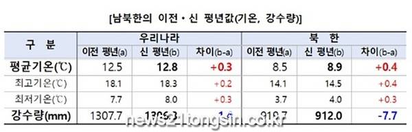 1991∼2020년의 기후를 토대로 새로운 기후평년값을 도출한 결과 북한의 연평균 기온이 이전 30년(1981∼2010년)과 비교해 0.4도 상승했다고 나왔다. 우리나라 연평균 기온 상승추세와 비슷하게 한반도 전체가 기온이 상승하는 경향을 보였다.